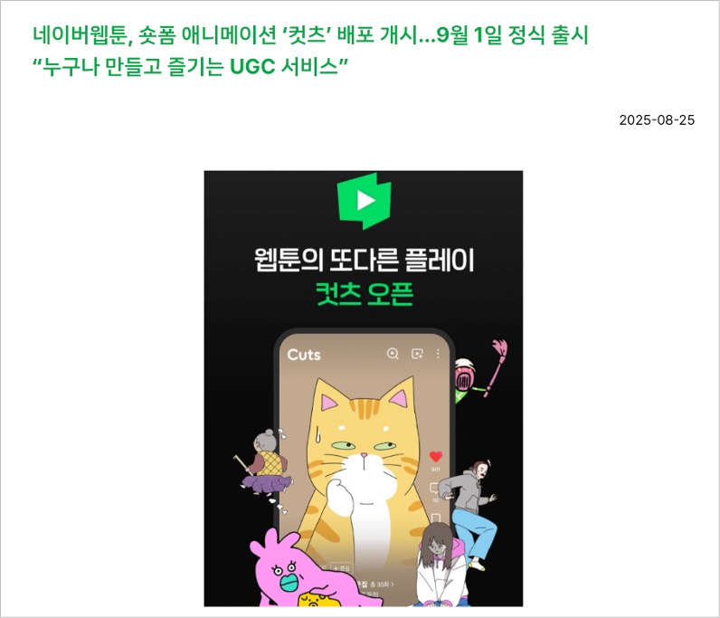 웹툰 앱 내에서 숏폼 애니메이션을 감상할 수 있는 컷츠 서비스를 오픈했습니다.
