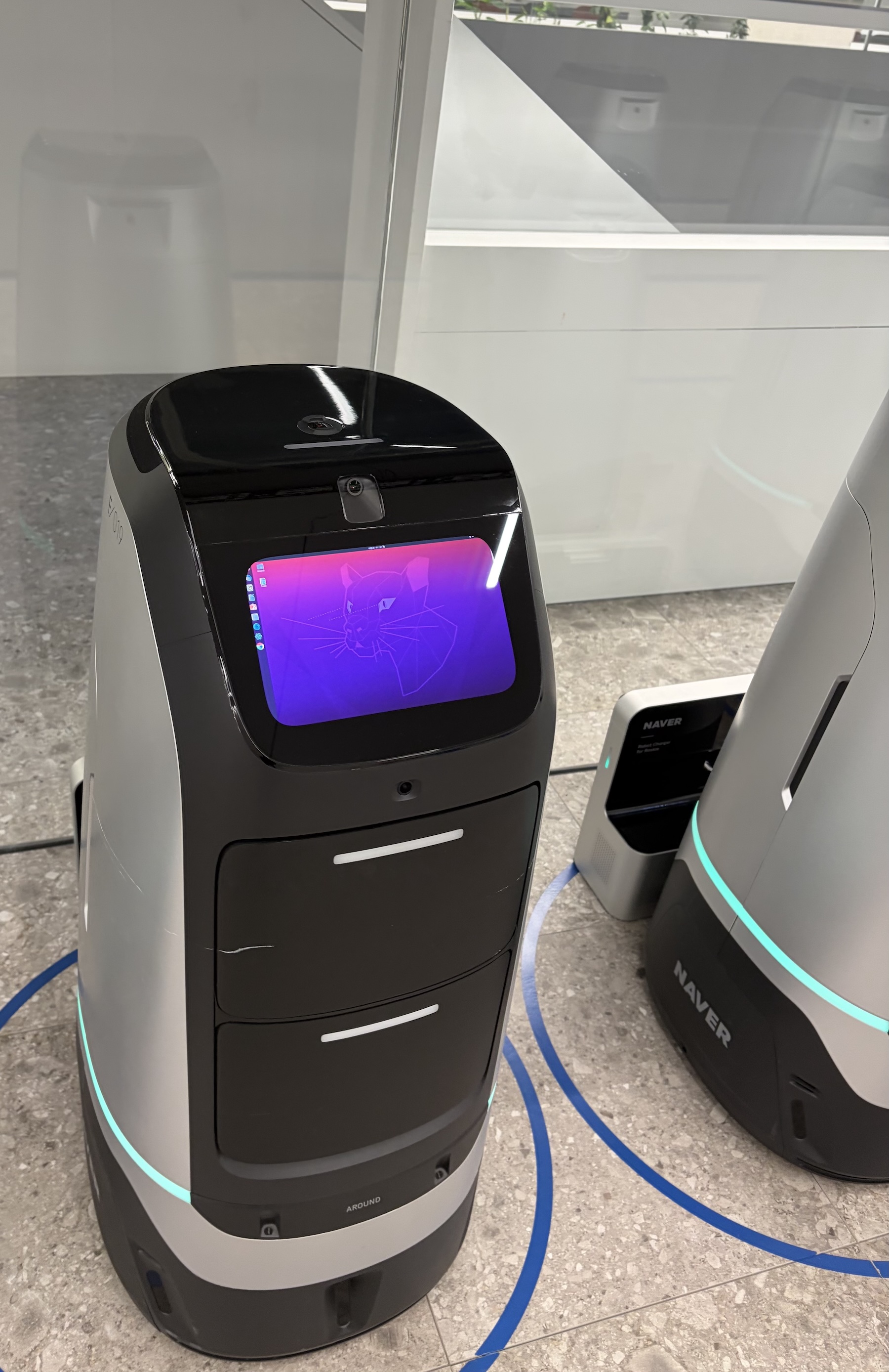 회사의 배달로봇 루키입니다. 잠시 멈춰 서서 리눅스 바탕화면을 띄운 채 쉬고 있는 모습입니다.ㅎㅎ 평소에는 이 모니터에 로봇의 표정이 표시됩니다.